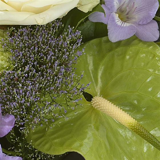 This attractive hand-tied features green Anthuriums, white Roses and scented Freesia.