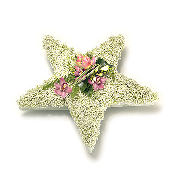 Based wreath of white Gypsophila with pink Orchid spray with complementary foliage and ribbon edging. Size: Height - 58cm (23") Width - 55cm (22").
