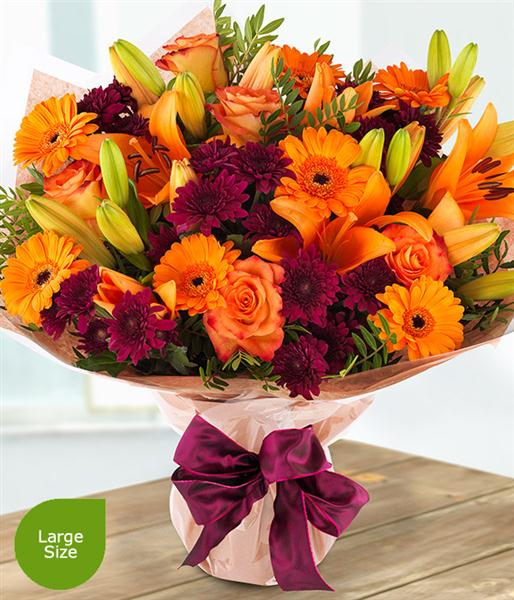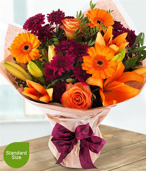 A sumptuous autumnal bouquet inspired by the colours of the season. Deep burgundy Spray Chrysanthemums sit perfectly amongst a glorious display of orange Roses, Lilies and Germinis.