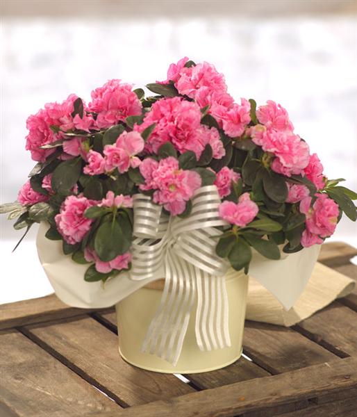 A beautiful pink Azalea plant presented in a rustic container.