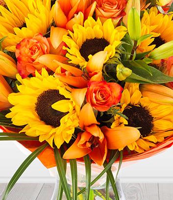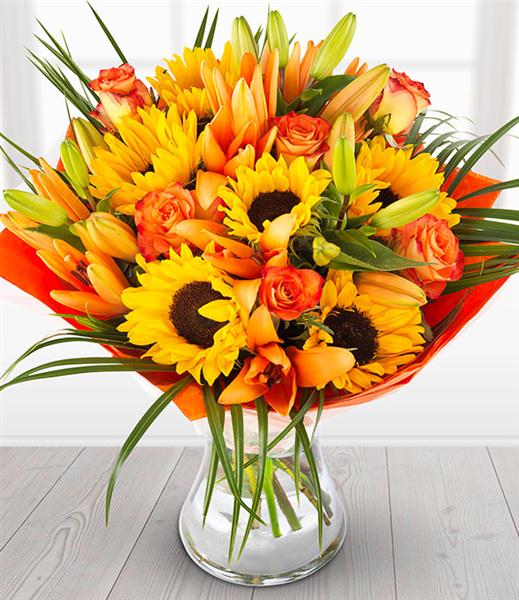 A striking arrangement of sunflowers and Inca Roses mixed with gorgeous orange Lilies.