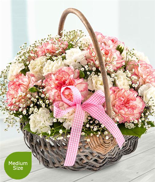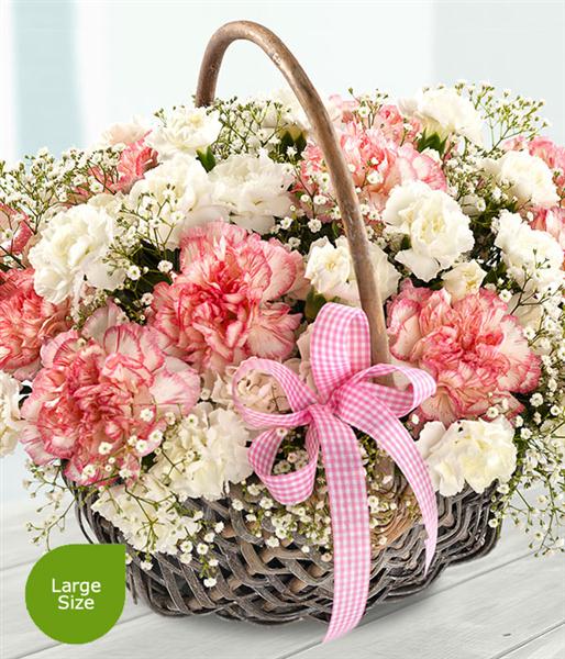A very pretty Mother's Day flower Basket Arrangement featuring pink and white Carnations, white spray Carnations and Gypsophila. Simply stunning.