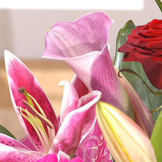 A seductive collection of flowers starring deep velvet Roses and fragrant Lilies. This is bound to capture anyone's heart.