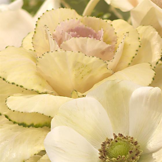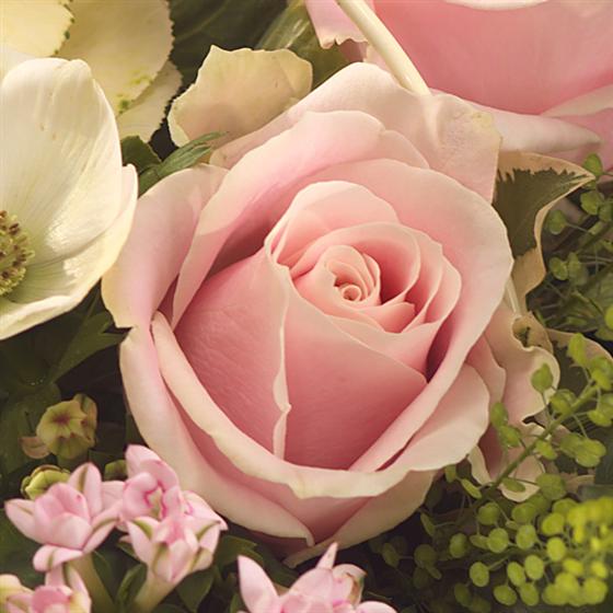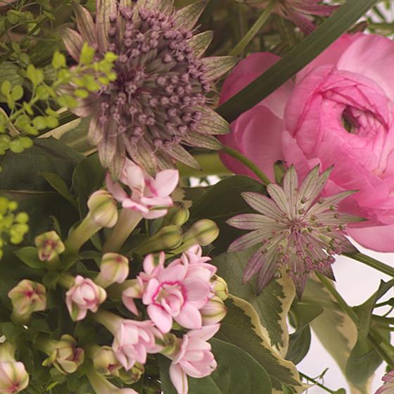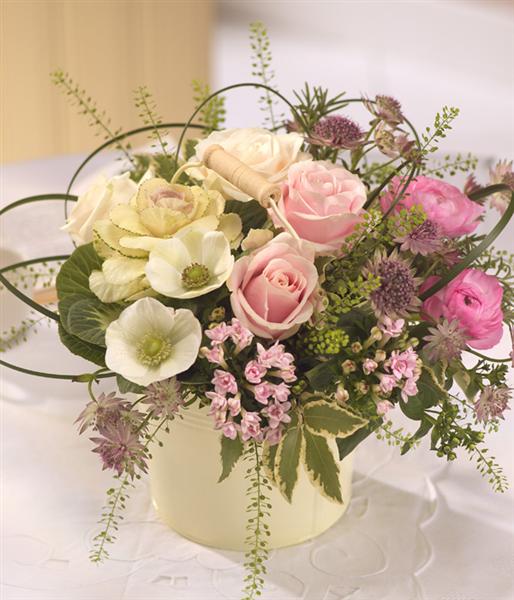 A light and airy design with a country garden feel in a beautiful cream bucket busting with pink and cream Roses, Brassica, Bouvardia and Ranunculus.