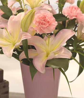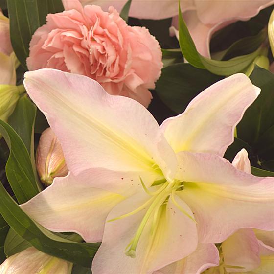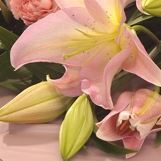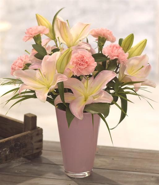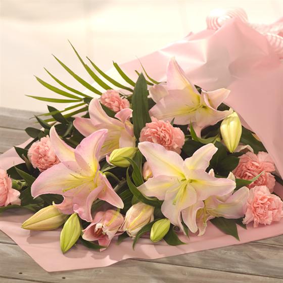 A bouquet of soft, summer favourites, pale pink Lilies and Carnations are beautifully presented and gift wrapped. Designed for someone who loves to arrange flowers. Add a vase to make it the perfect gift.