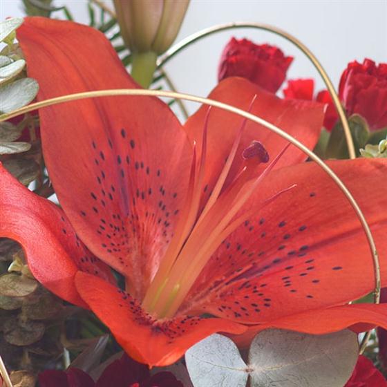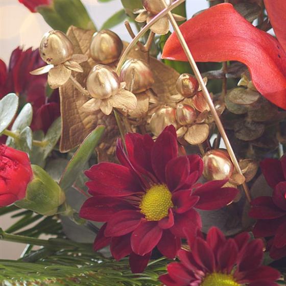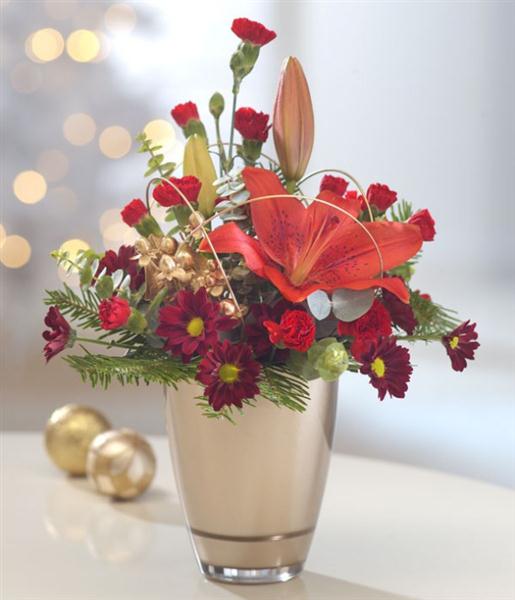 An attractive arrangement of rustic reds in the form of Lilies, Chrysanthemums, Carnations and Hypericum Berries, presented in a gold vase. A simply lovely Christmas flower gift and ideal centre piece.