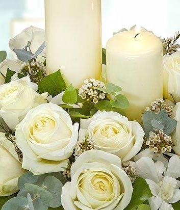 A classic white candle centrepiece arrangement. White Roses, Dendrobium Orchids and Wax Flowers complemented by Aralia & Hosta leaves and a dash of Eucalyptus.