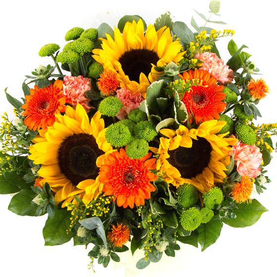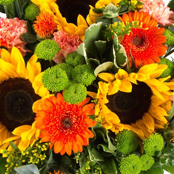 Sunflowers are the focal point of this dazzling, citrus hand-tied bouquet. To avoid disappointment please contact os to confirm sunflower availability.