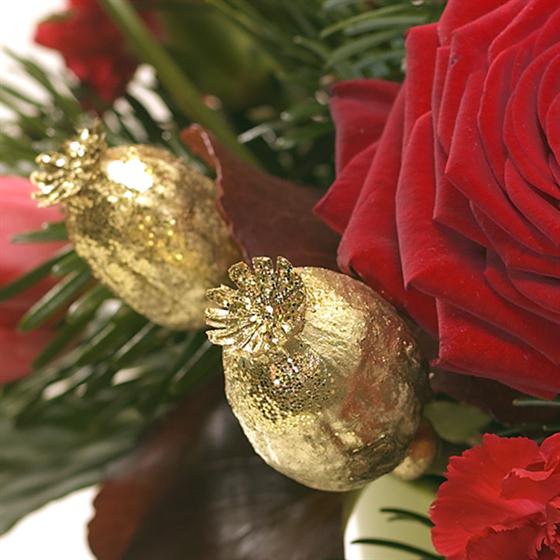 Magnificent red Roses, beautiful ruby red Tulips, deep red velvety Carnations and gold coloured Poppy heads, nestled in amongst winter foliage. A stunning Christmas flower arrangement.