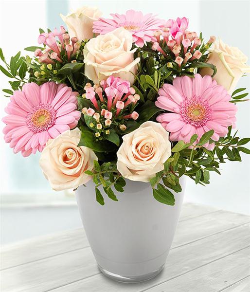 A silver glass vase arrangement featuring pink Roses, Germini & Bouvardia blooms.