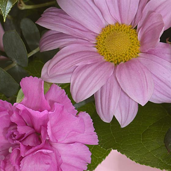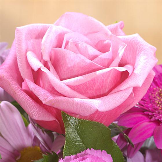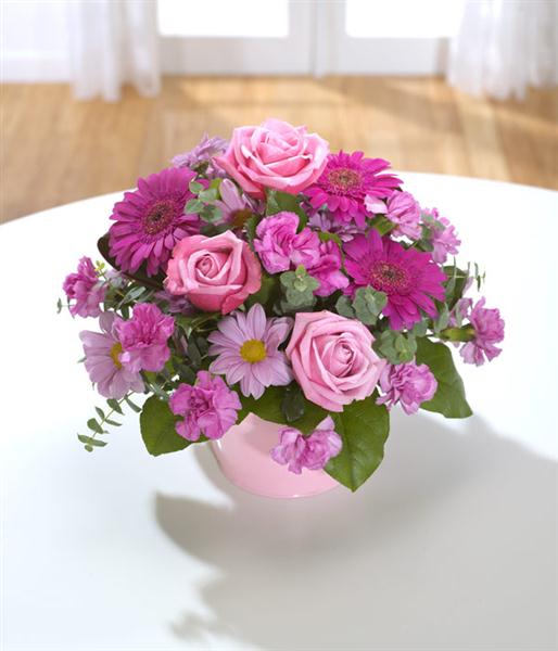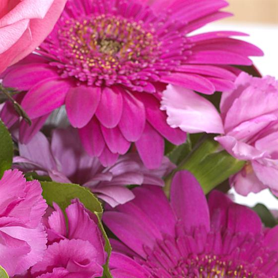 A compact arrangement of pink Roses, Germini, Chrysanthemums and Carnations.
