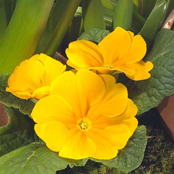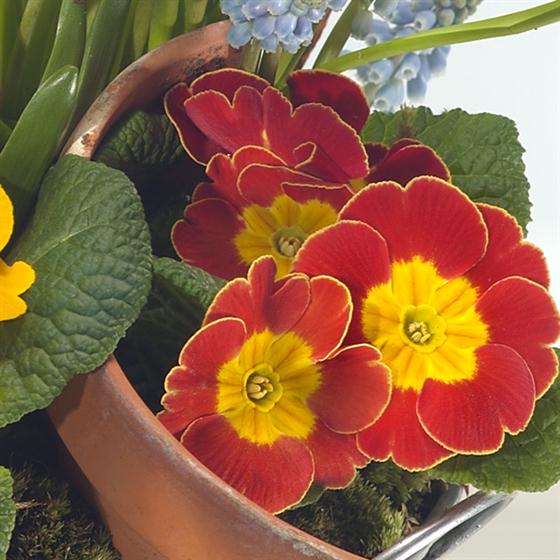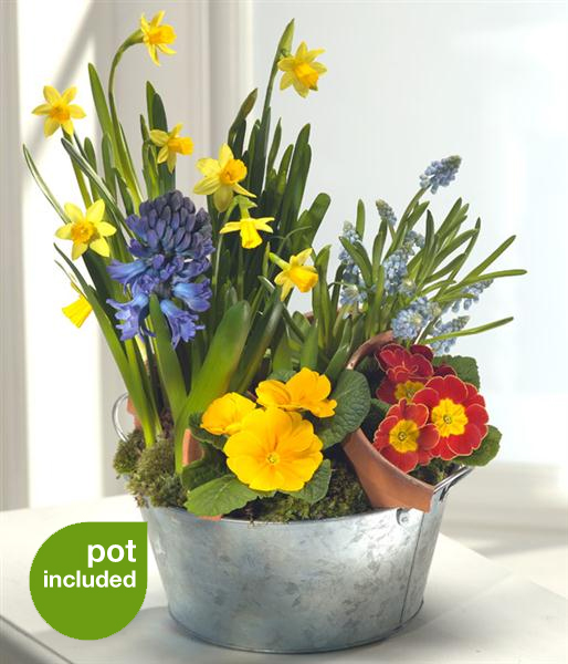 Ideal table setting or feature arrangement. Yellow Tête-à-tête Narcissi have been expertly combined with fragrant blue Hyacinth and Muscari, whilst the yellow and orange Primroses complete the springtime look perfectly.