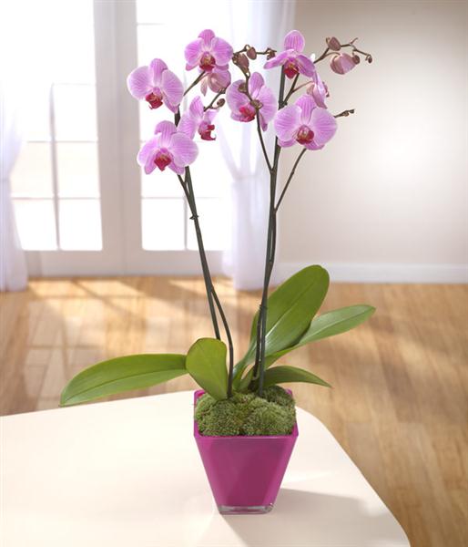 A stunning Phalaenopsis Orchid plant in a gorgeous cerise vase - simple and elegant.