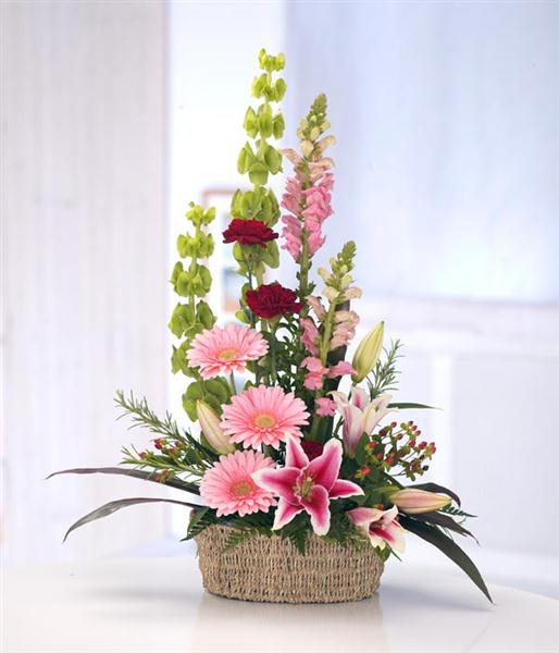 A very charming mixed basket arrangement featuring Gerberas and Lilies. Flowers are arranged in floral foam for long lasting freshness and easy display.
