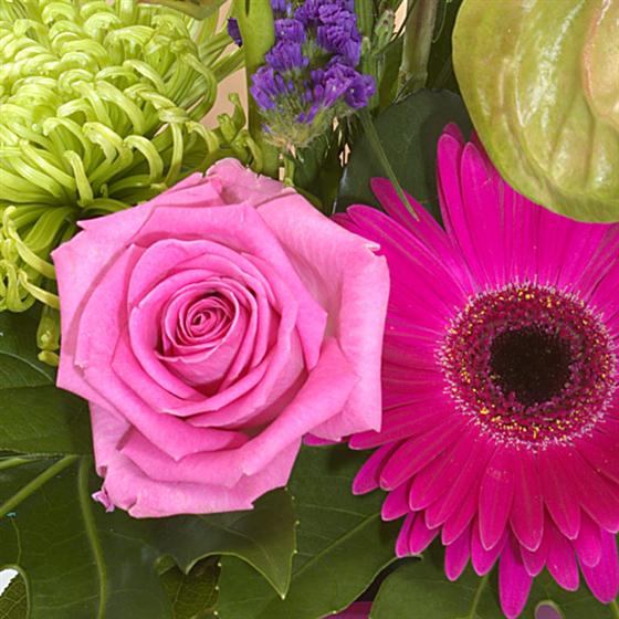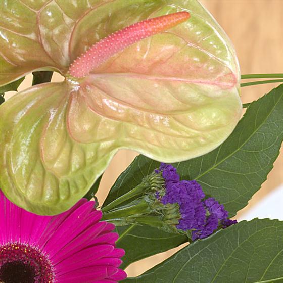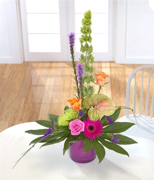 An elegant and stylish design with height provided by Molucella and Liatris. Roses and Gerbera temper the tropical green Anthurium and bloom Chrysanthemum.