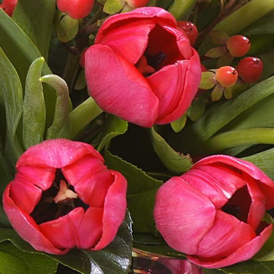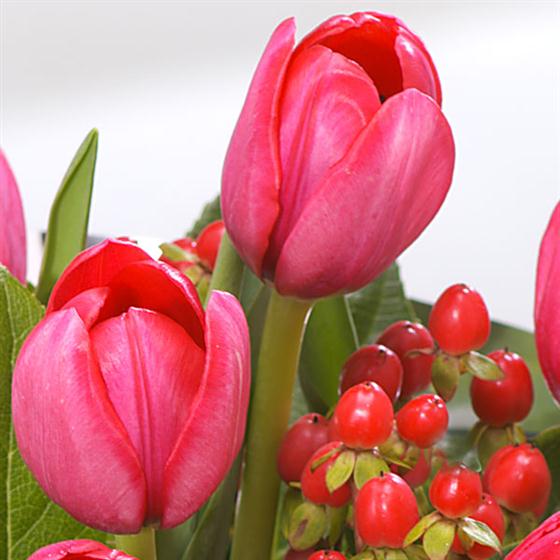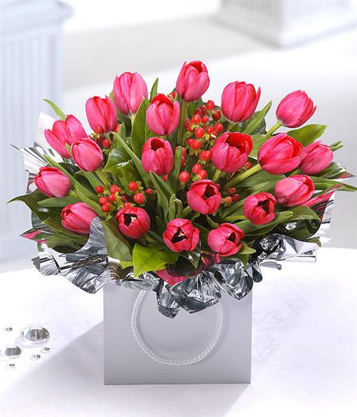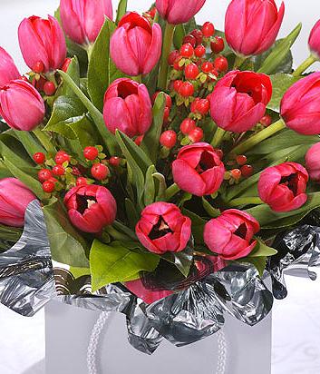Pink Tulips in a hand-tied design with Hypericum. Aqua packed for freshness and presented in a gift bag.