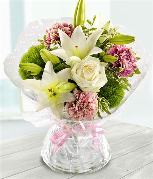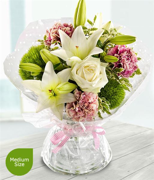 A simply stunning Mother's Day Bouquet. White Roses and Lilies married with pretty pink Carnations are neatly nestled in a glorious array of green foliage.