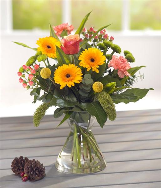 A sumptuous aqua-pack arrangement of orange Roses, set against golden Germini, create this glorious autumnal inspired bouquet. Vase not included.