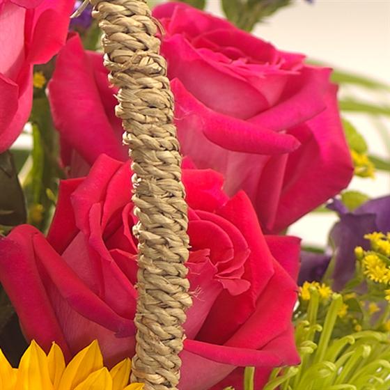 A colourful, sunshine basket arrangement containing bright Sunflowers and hot pink scented Roses. A simply stunning, fuss free flower arrangement. A balloon this makes this an ideal birthday gift.