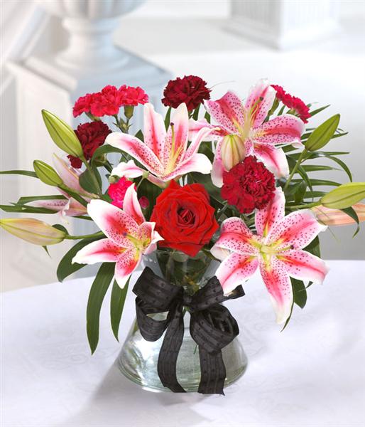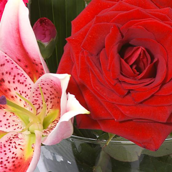Striking pink Lilies, mixed with deep red Roses and Carnations. A generous bouquet to show your love.