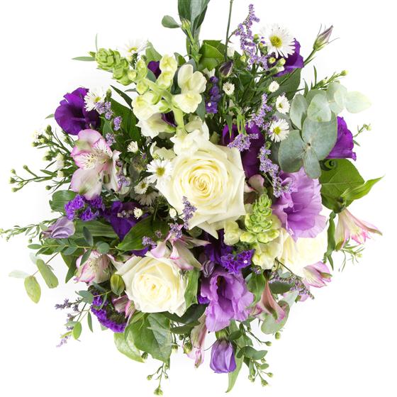 A sweet arrangement in shades of whites, creams, lilacs and purples including roses, september flower, lisianthus and alstromeria.