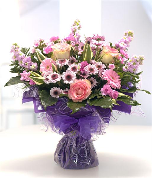 A lovely aqua pack hand tied bouquet in subtle shades of pink & white, beautifully packaged in complimentary colours.