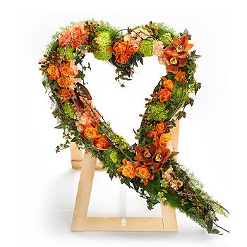 A contemporary orange swinging heart design featuring Roses, Calla Lilies, Celosia, Gerbera, Chrysanthemums and Carnations.