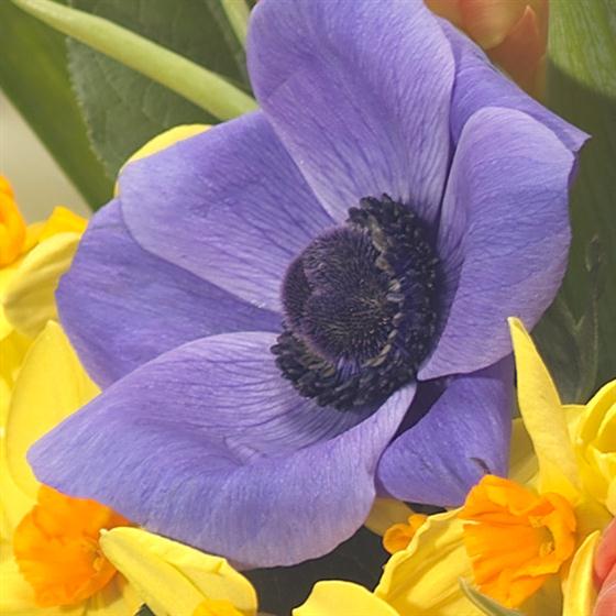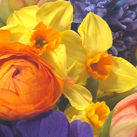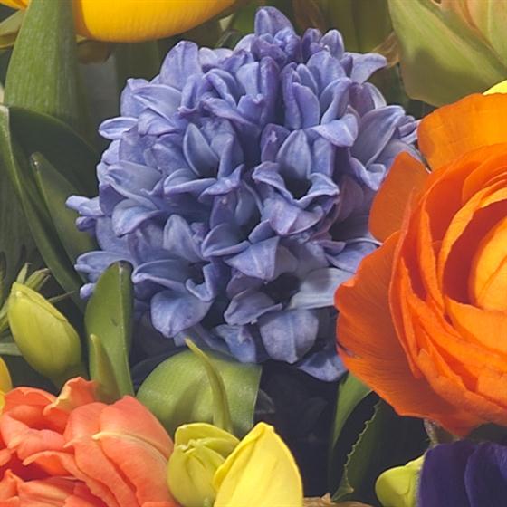 This aqua pack bouquet is bursting with colour and beautiful spring scents. Blue Hyacinth and Anemone complement the Orange Tulips and Ranunculus perfectly letting the sunshine Yellows of the Paperwhite Narcissi and Ranunclus shine through.