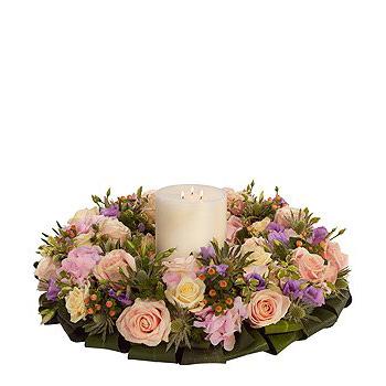 A triple wick church candle encompassed by a pretty pastel wreath. Pink and cream Roses, pink Hydrangea and Hypericum are mixed with purple Lisianthus and white Eryngium.160