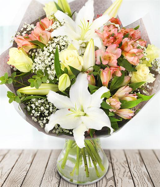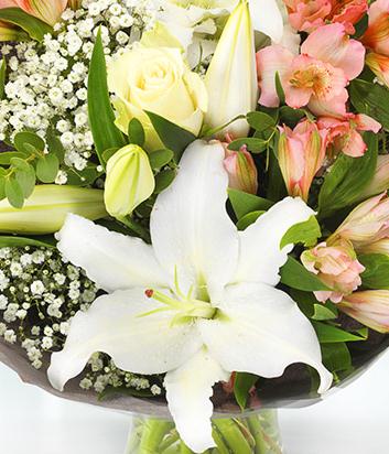 Delight her senses this Valentine's Day with this devinely, delicately fragrant bouquet. Pure white Oriental Lilies and Roses married with pretty pink Alstroemeria.