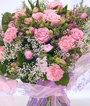 A beautifully pretty hand-tied bouquet of mixed pink flowers including pink Roses, Alstromeria, Carnations and Gypsophila. Pastel packaging complement the flowers which are supplied in an aquapack for instant display.