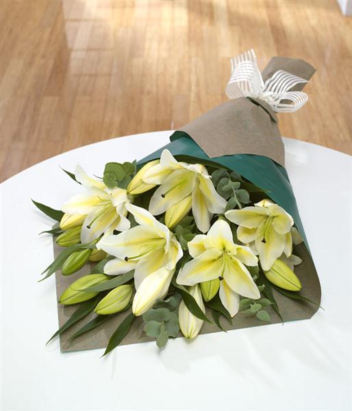 This bouquet is gift wrapped in cellophane/paper with a natural raffia or similar bow