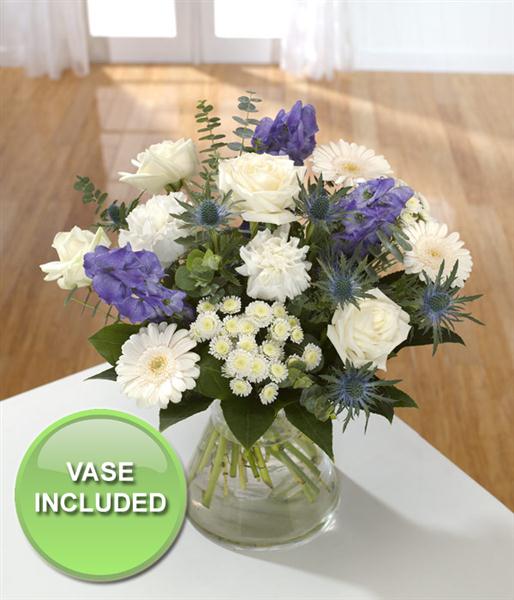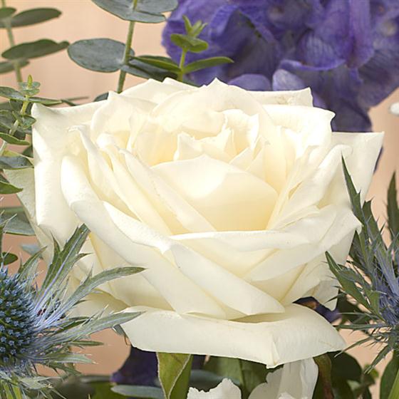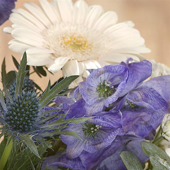 Whites all the way with Roses, Carnations and Chrysanthemums. Aconitum and Eryngium add the accents of blue.