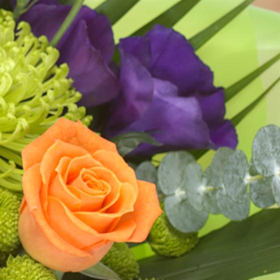 Stunning pink Roses are the stars of this basket arrangement. Zesty orange Gerbera, zingy greeen Chrysanthemum, purple Lisianthus and Hypericum combine to form this vibrant design.
