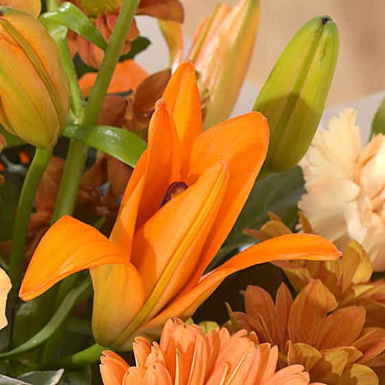 Lilies, Roses and Germini take the lead in this stunning hand tied arrangement delivered in water for extra freshness with orange Chrysanthemums and gold Carnations providing signature notes.