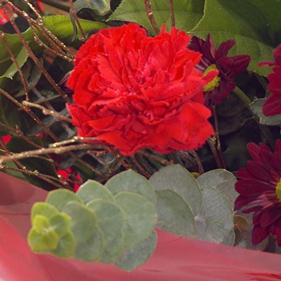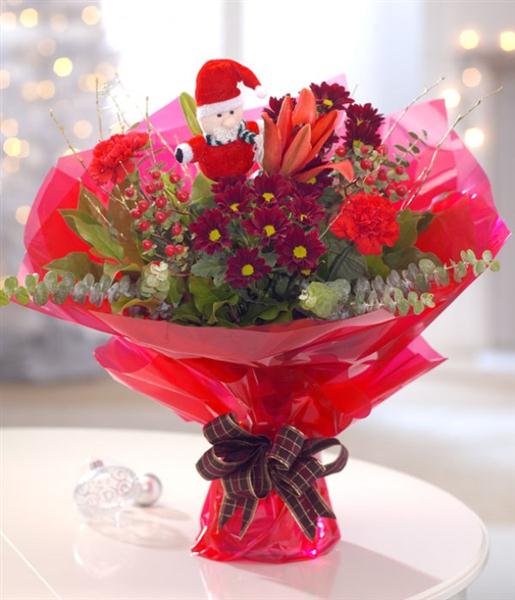 A bright bouquet of rich reds and Santa! Chrysanthemum, Carnation, Lily and Hypericum make this a lovely Christmas flower combination.