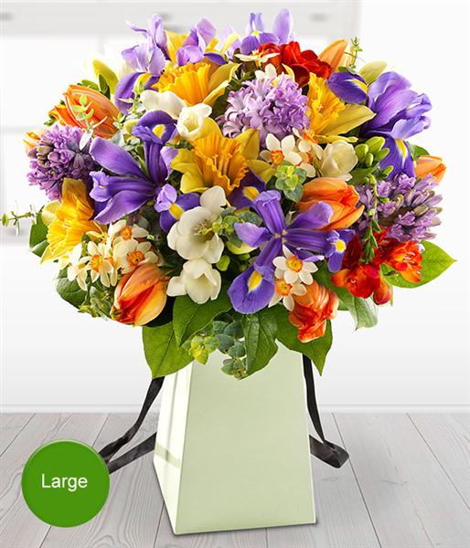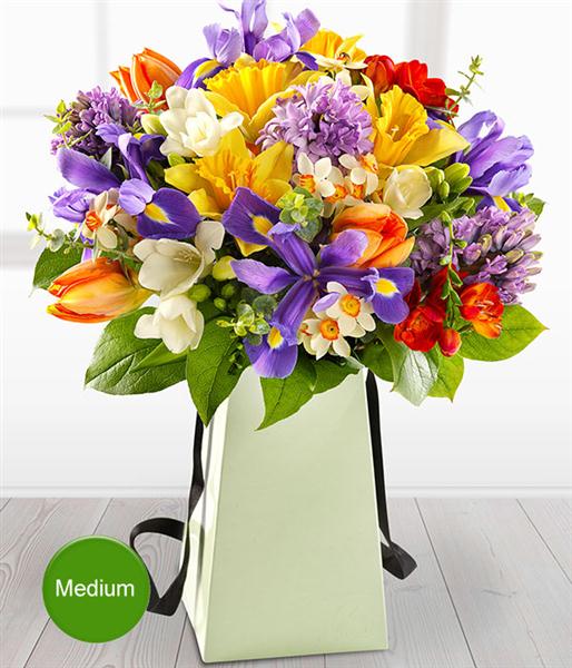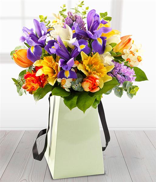 All your spring flower favourites in one incredibly aromatic aqua gift bag arrangement. Daffodils, Freesia, Tulips, Iris, Hyacinths and Narcissi.