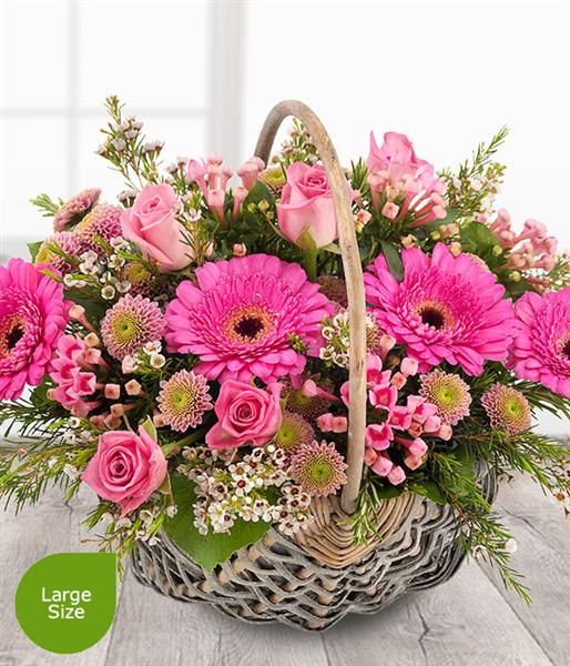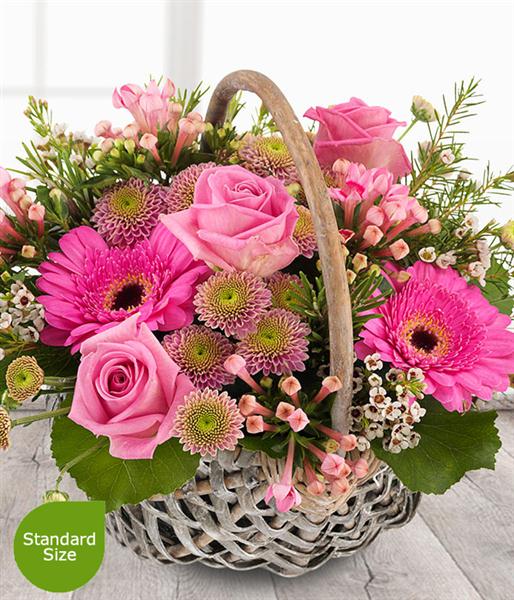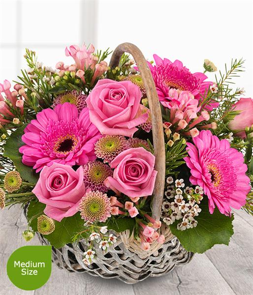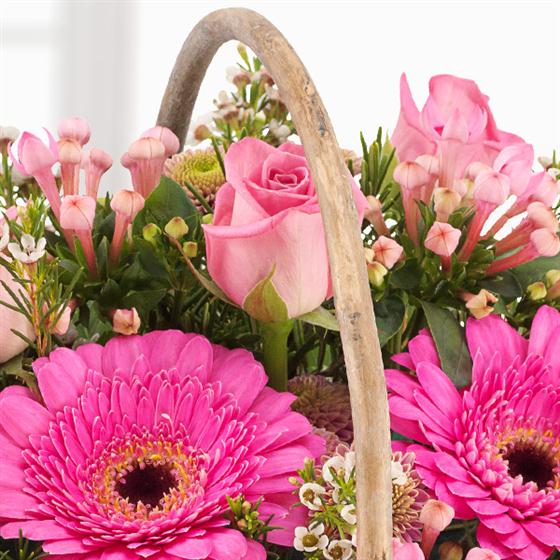 A pretty pink flower basket. Roses, Spray Chrysanthemums, Bouvardia and Germinis coupled with delicate cream Wax Flowers.