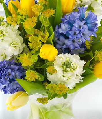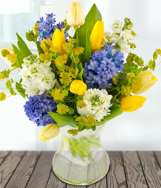 This bold and beautiful bouquet of blue hyacinth, white stock, cream and yellow tulip topped with bupleurum is the perfect way to brighten their day.