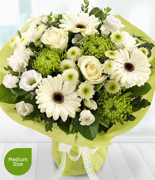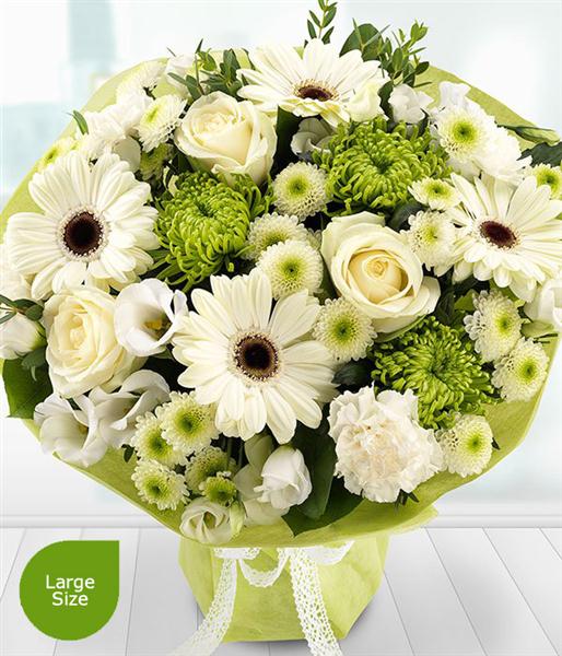 Includes White Roses, White Gerberas, White Lisianthus, Green Chrysanthemums, White Spray Chrysanthemums, White Carnations, Eucalyptus, Salal.