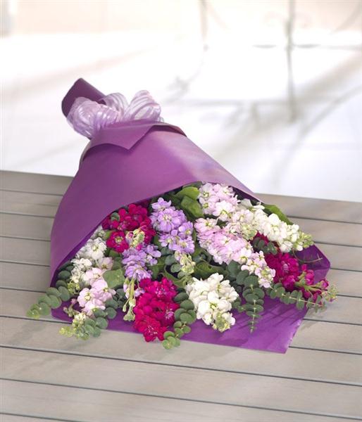 A simple wrap of Stocks in mixed shades of cerise, mauve, pink and white. Stunning and fragrant too.