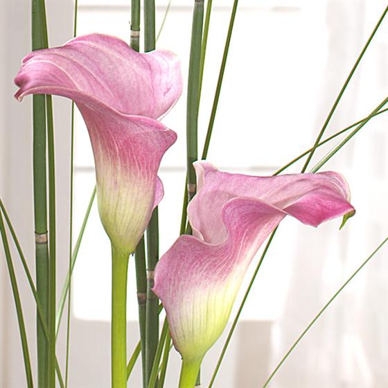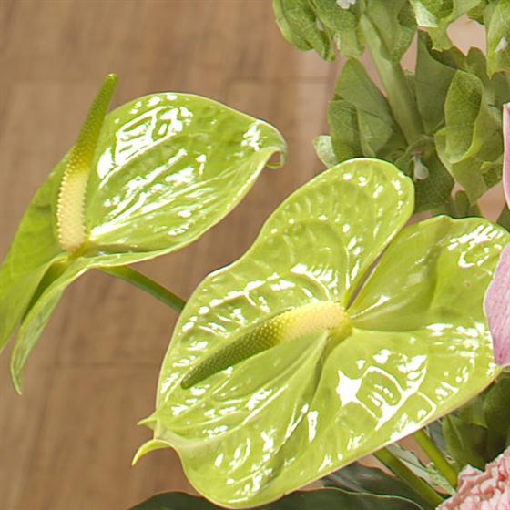 Pink Cymbidium Orchids and Calla Lilies are the heroes of this statement design. Built on a base of frilly pink Carnations and Calathea leaves and accented with green Anthurium.