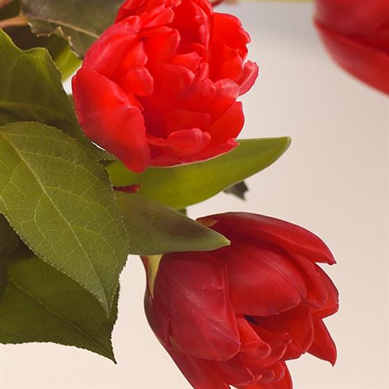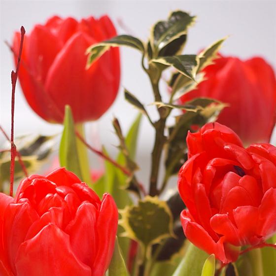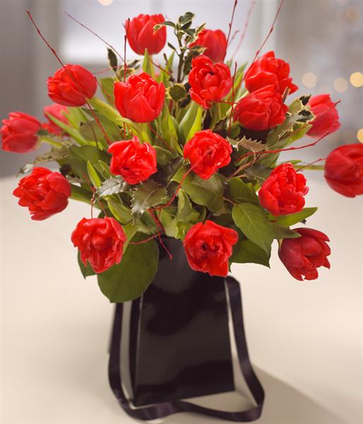 Ruby red Tulips in a glossy black flower gift bag. An exquisite present for the one you love this Christmas.