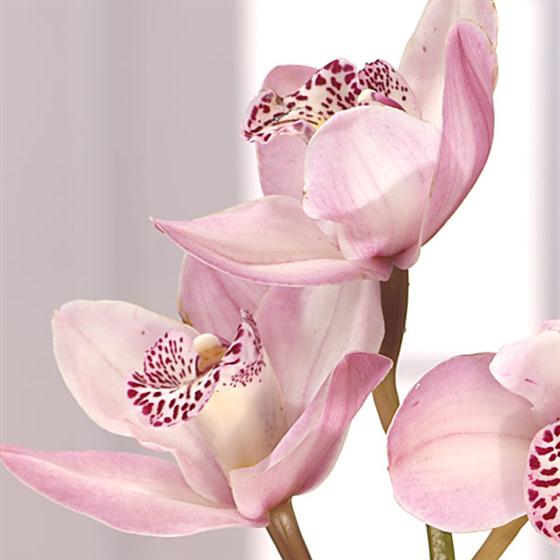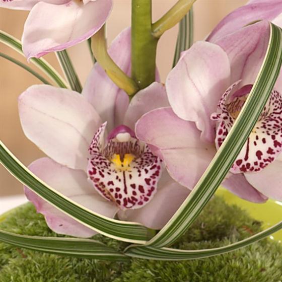 A striking vase arrangement starring pink mini Cymbidium and variegated grass in a contemporary lime green vase.