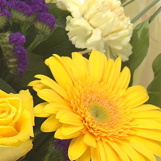 Shades of yellow Roses, Gerbera and Carnations mingle with purple Lisianthus and Statice for a bold effect in this luscious aqua pack.