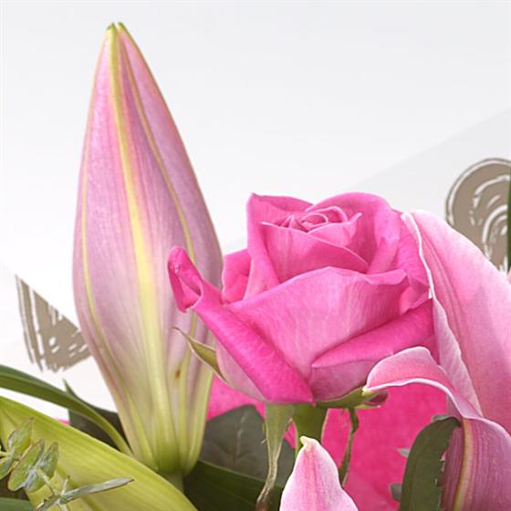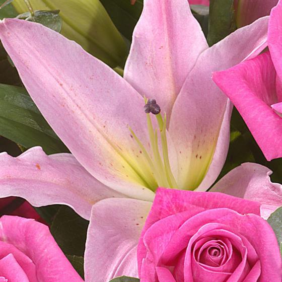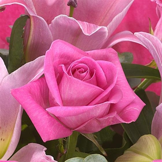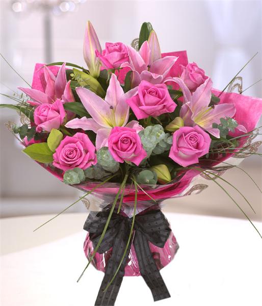 Perfectly a dozen pink Roses and Lilies for somebody special, this pretty aqua pack will melt her heart.