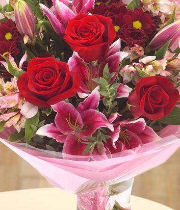 A rich, luscious bouquet of deep red Chrysanthemum blooms and velvetly red Roses, neatly nestled along side beautiful Cobra Lilies.