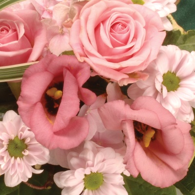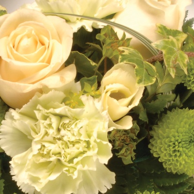 Open round wreath includes Roses, Carnations, Eustoma, Chrysanthemums with natural foliage edge. Size: Diameter - 36cm (14").