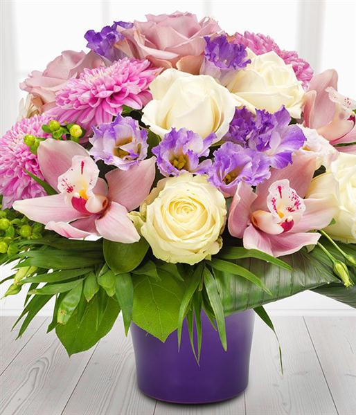 Add a touch of the tropics with this absolutely stunning flower arrangement. Pink Orchids, Roses and Dahlias with cream Roses, purple Lisianthus and gorgeous green Hypericum Berries in a purple ceramic pot.
