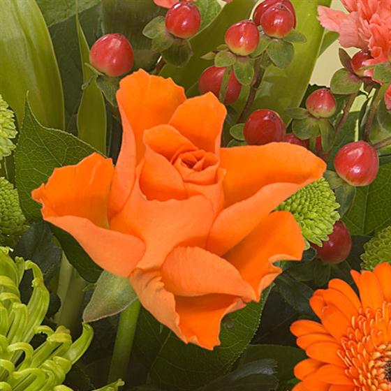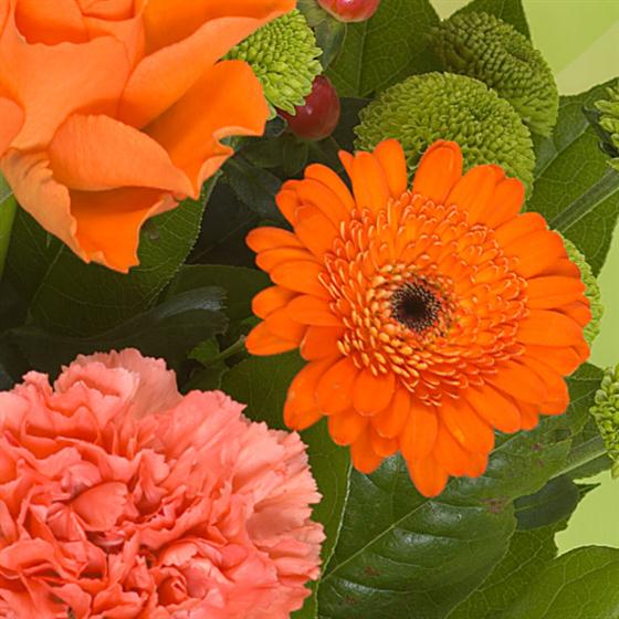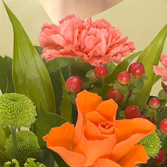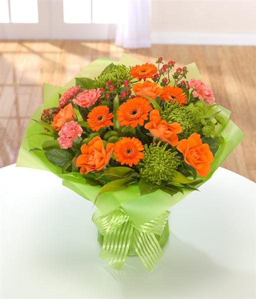 Striking orange Germini and Carnations hand-tied delivered in water mixed with green bloom Chrysanthemum beautifully gift wrapped.